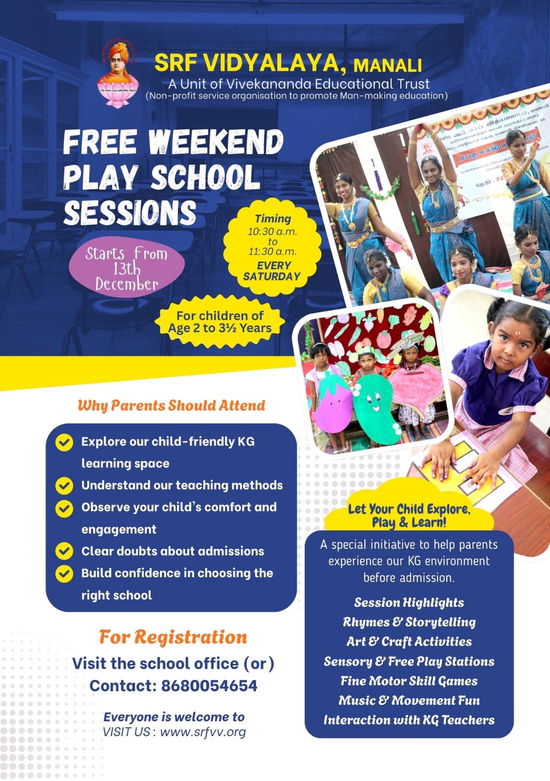 Parent of S. Navasri Aathira - ArunaThe school provides a safe and happy environment for our child. The teaching methods are playful and age appropriate. We would love to see more focus on interactive learning tools, story based teaching, and outdoor activities to balance academics with creativity. Thank you for guidance.